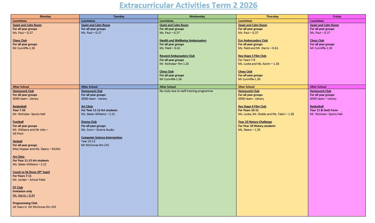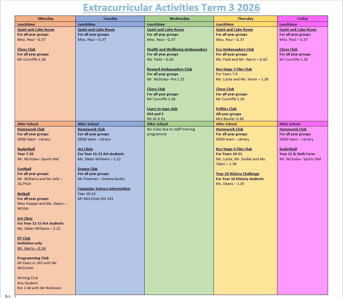 - After school clubs run from 3.15-4.15pm. Students should meet at the venue indicated on the timetable, except for PE clubs (where students should meet in the changing rooms). Students attending an after school PE club are expected to wear PE kit.